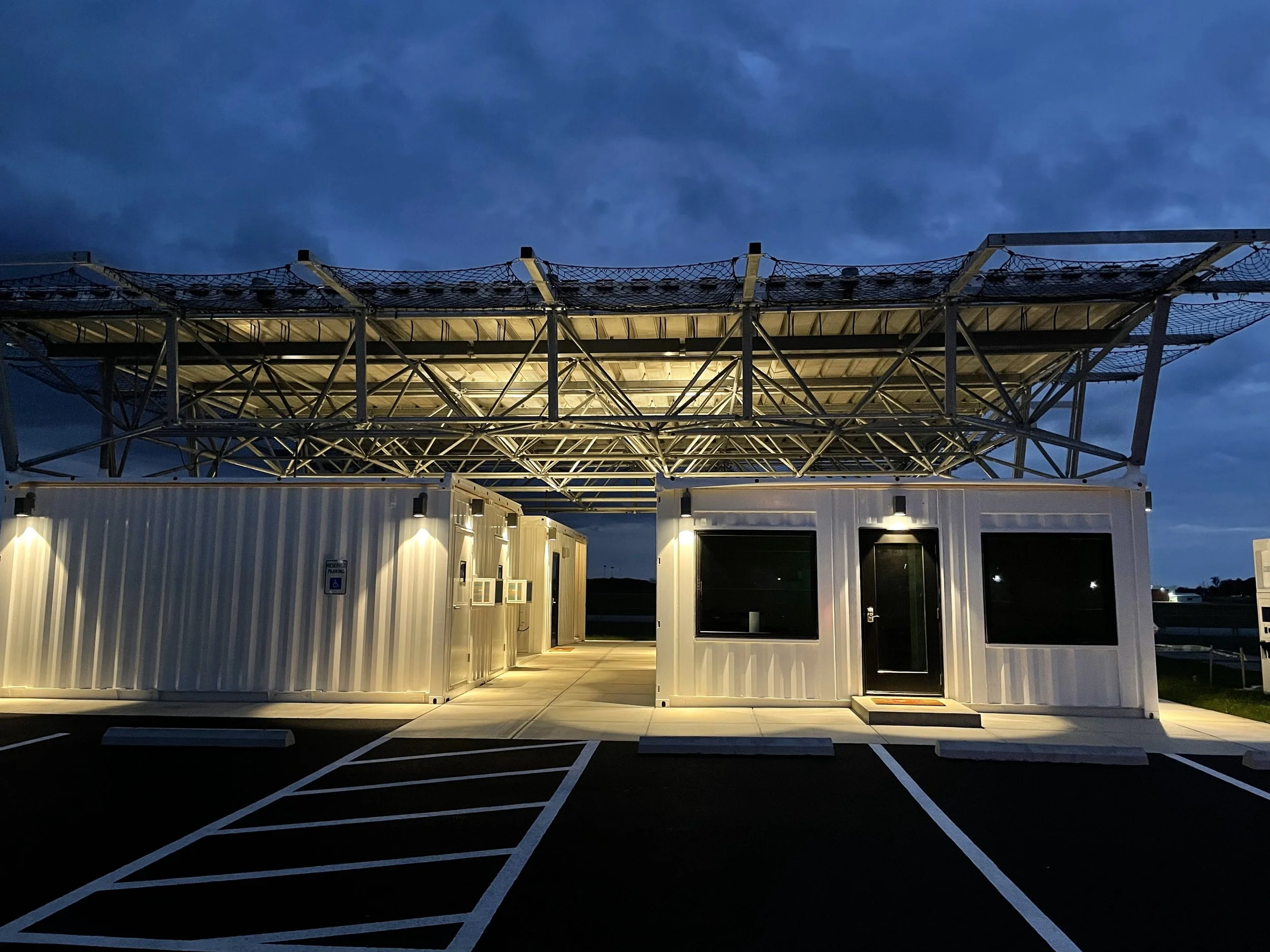 Working with cargo containers was new for the Kapp team. Typically, Kapp crews construct buildings from scratch, so there was an added challenge using BETA’s prefabricated containers. The containers needed to be engineered to safely support the immense weight of the charging station, while also including windows to provide natural light in the pilot offices and lounge areas.